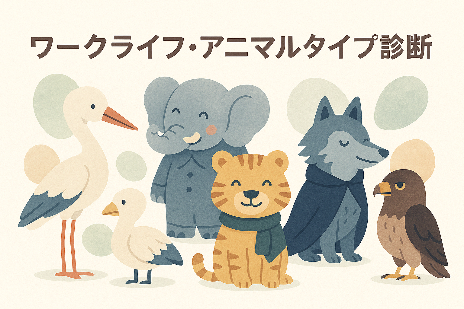 本診断は、子育て期の「価値観」「働き方スタイル」「キャリア志向」の3軸を掛け合わせ、あなたの両立タイプを判定します。結果はアニマルモチーフ(例:コウノトリ=家族志向、ゾウ=安定、トラ/オオカミ=挑戦、タカ=俯瞰…)+役割名で表現。タイプごとの強み・注意点・すぐ使えるアクションを提示し、日常の意思決定やチーム内の役割分担に生かせます。